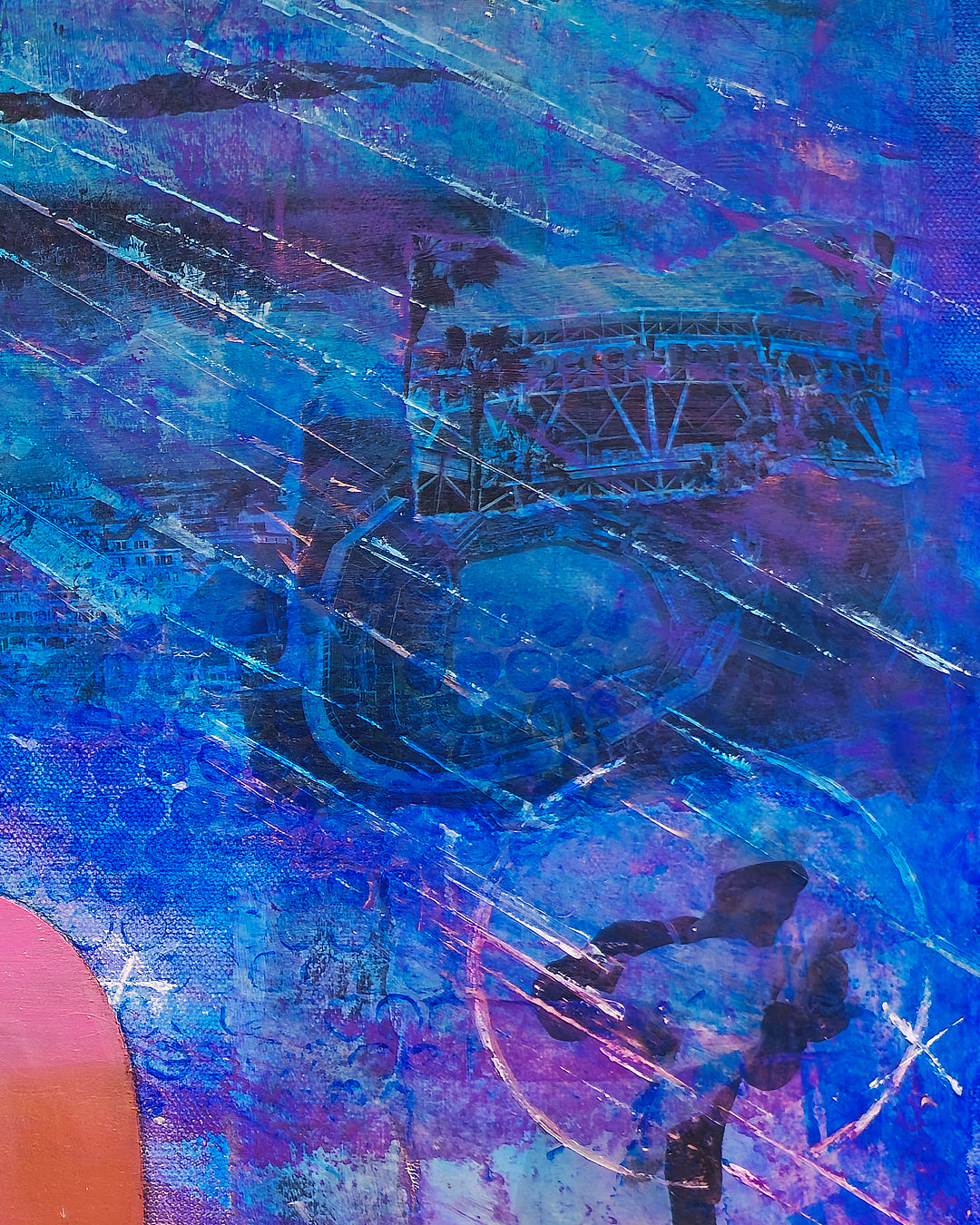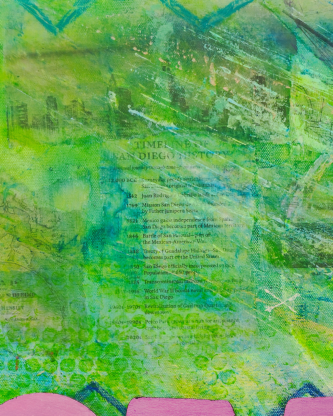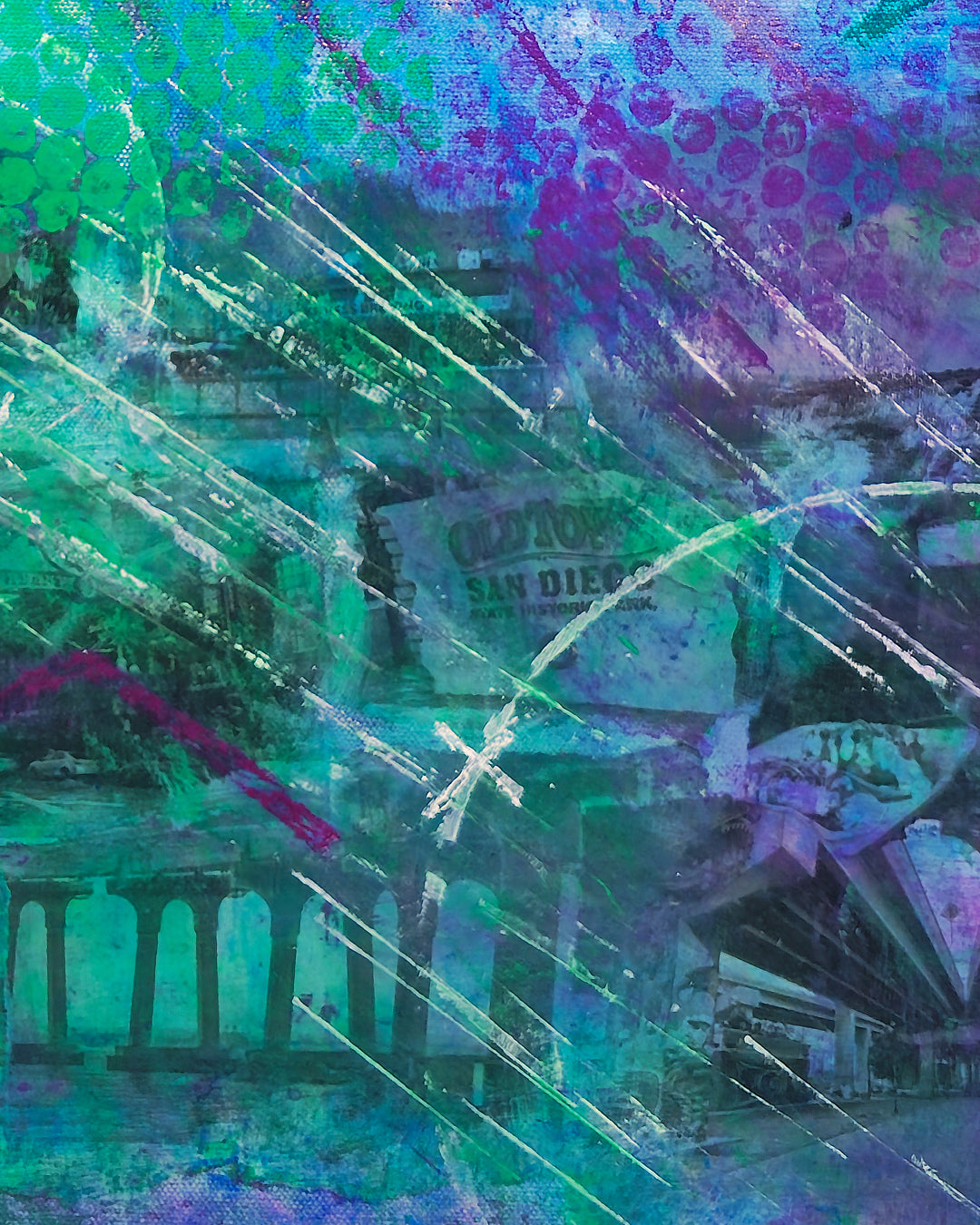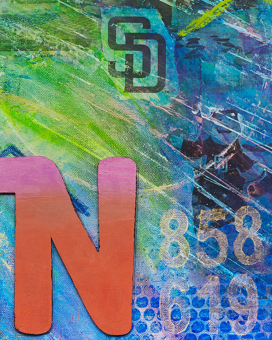“America’s Finest City” is an original mixed media artwork that celebrates the vibrant spirit of San Diego. Bursting with bold colors, layered textures, and iconic local details—from the 858 & 619 area codes to cultural and coastal symbols—this piece is both nostalgic and uplifting.